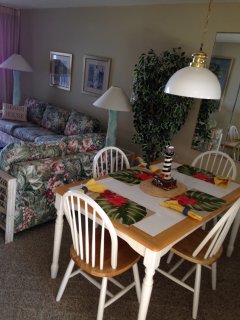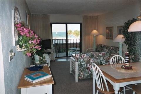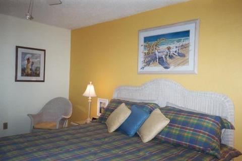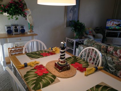 This unit is completely furnished in a “beachy” decor. It has 1 1/2 bedrooms (one large master bedroom with a king sized bed and a small bunk bed room ideal for kids), 1 complete bath, living room with a pull out sofa bed, dining area and fully furnished kitchen with microwave, toaster oven, blender, coffee maker, full frigerator, glass-top range, oven and dishwasher. There are 2 NEW HD televisions with VCR/DVD players, local phone, cable and FREE WI-FI. Leave your beach towels, sand chairs, beach umbrellas, wave boards, and beach toys at home. All are provided for your convenience.